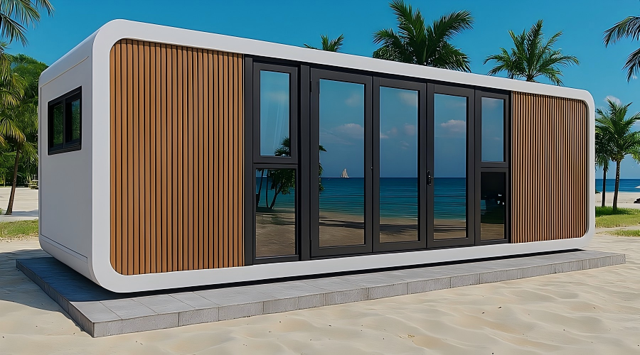 Avec son design arrondi et sa façade vitrée contemporaine, l’Apple Cabin se distingue par son style moderne et raffiné. Plus qu’une simple maison modulaire, c’est un véritable espace de vie tendance, idéal pour le glamping haut de gamme, les locations Airbnb ou un bureau créatif.
